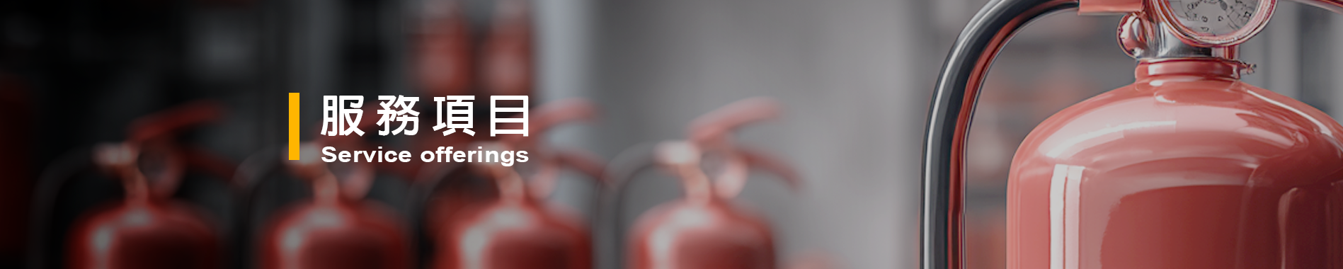 消防安全設備器材批發 零售/滅火器性能檢查測試 消防安全設備維護保養 消防安全設備工程設 計規劃施工 各類場所消防安全 設備檢修申報業務 消防圖說審查及竣工查驗 會審會勘業務 高科技廠房定期保養 維修服務